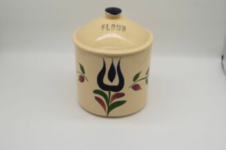 Authentic Watt Pottery Dutch Tulip #81 flour canister in base has a craze line on side – does not show on inside – clean / lid has rim chip.