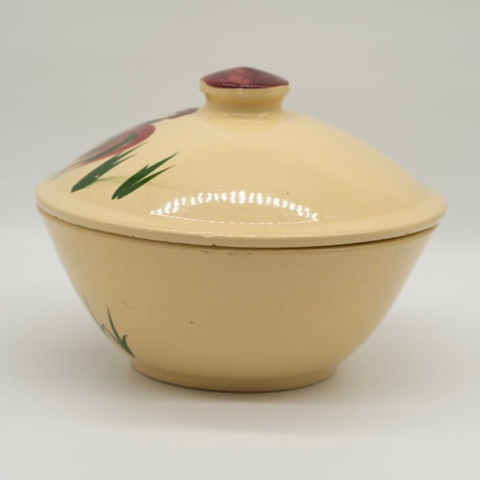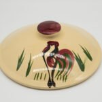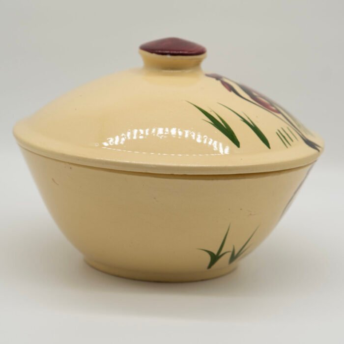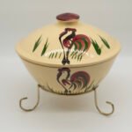 This is one of the more visually striking Rooster pattern pieces, especially when paired with the original metal stand — a combination collectors actively look for.