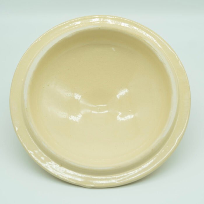 No chips or cracks. Interior shows typical use staining. Lid is in excellent condition. Displays very well overall.