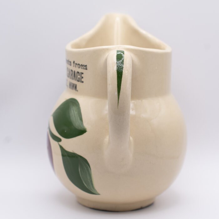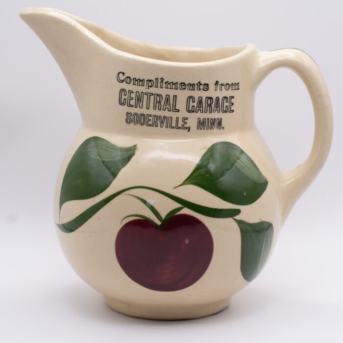 Authentic Watt Pottery #15 Apple Pitcher. Almost perfect – bottom rim has two burn marks not visible displaying – advertising from central garage Soderville Minn.