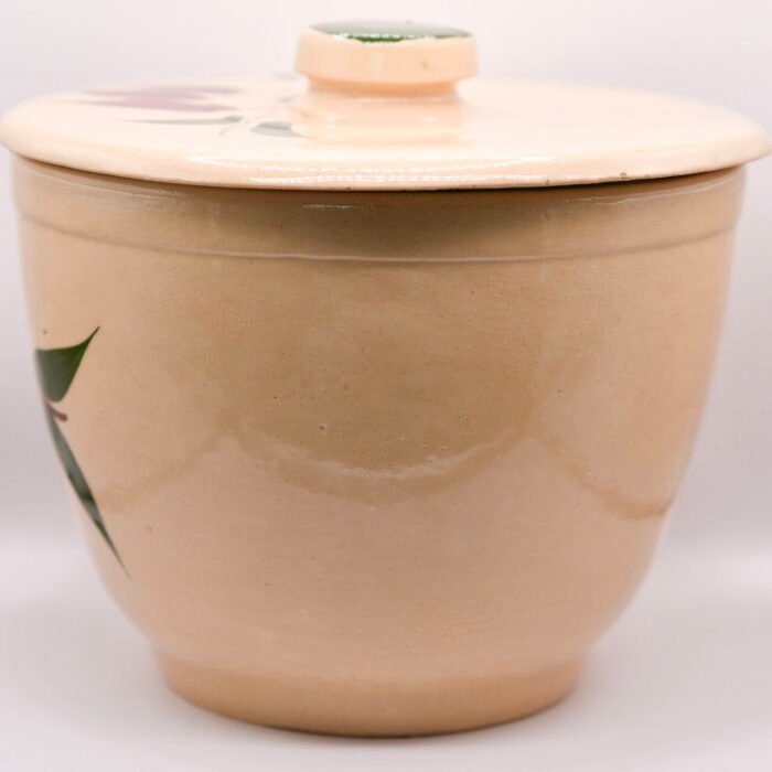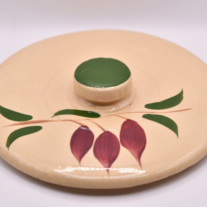 This vintage Watt Pottery Teardrop #59 Ice Bucket displays excellent color, clean glaze, and characteristic hand-painted detail. Condition: Very, Very near mint. There is the tiniest little knick on the underside of the lid that almost isn’t worth mentioning keeping this from being mint. It’s clean bright and shiny. Displays perfect. Nice deep colors to match..