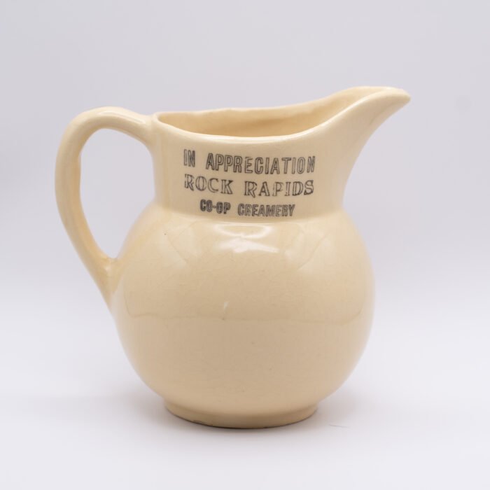 Authentic Watt Pottery #62 Apple Creamer. Excellent condition good colors – also has advertising from rock rapids co-op creamery.