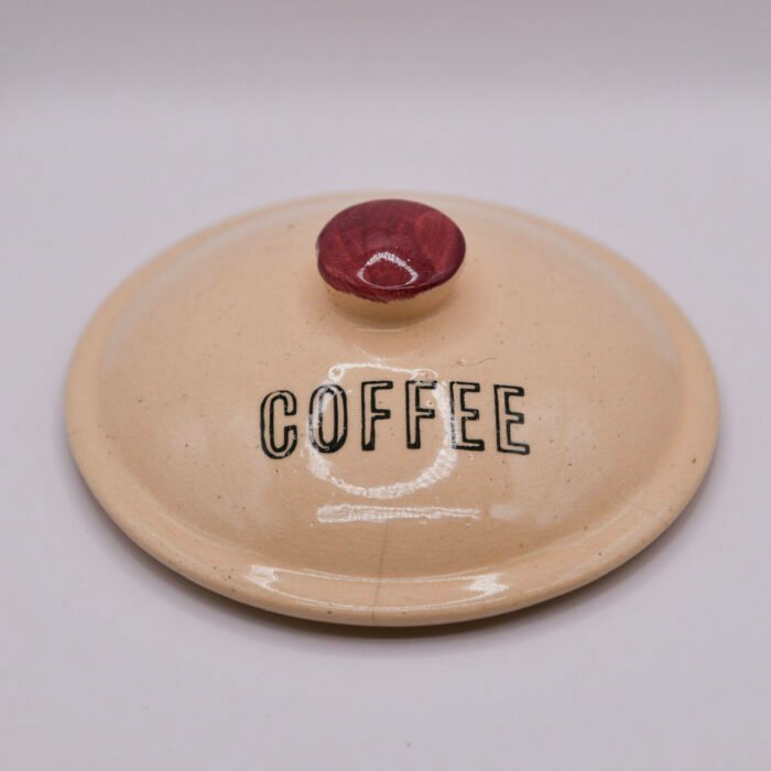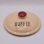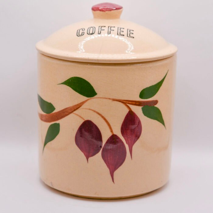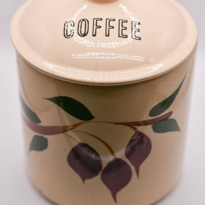 This vintage Watt Pottery Teardrop #82 Canister displays excellent color, clean glaze, and characteristic hand-painted detail. Condition: Base is pretty good on this Coffee canister. Lid has two tight hailines. One goes to the underside the 2nd does not. Base has a bottom rim chip ( I think ) might be factory. Does not show on display. Still a good one to have..