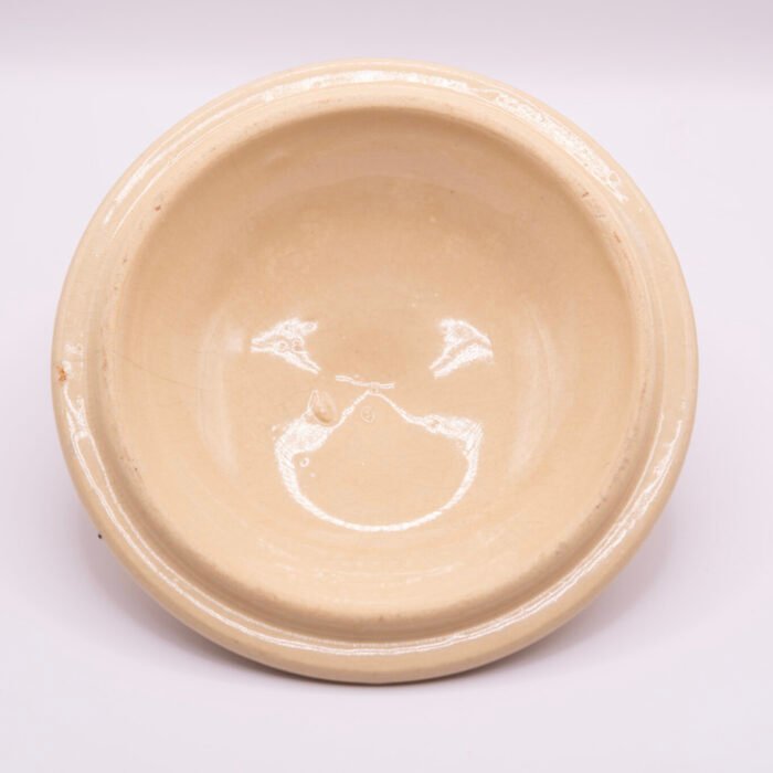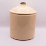 – Condition Notes: We love these 82 cannisters. They always display nice. This one is in pretty good condition. Base has a small glaze pop mold flaw on the upper rim. Typical for Watt Pottery. Lid has what I’m calling a heavy craze line on the underside of the lid. It does not show on the top side. Small flat tiny tiny nick on outer edge of lid.