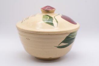 Authentic Watt Pottery #05 Apple Bowl. Bowl with lid – slight staining on inside of bowl – few factory glaze pops on bowl -lid is in good condition with advertising – Warme Furniture Newell Iowa.