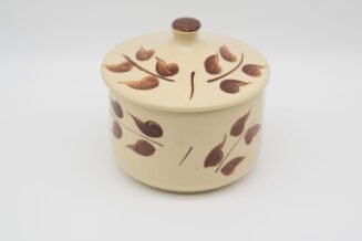 Authentic Watt Pottery #1 Autumn Foliage Grease Jar. Condition: I purchased this sight unseen. Don’t do that. The lid is in mint condition. The base is what my lesson you should learn for yourself. It has a inside crack. It appears to have been refired in a kiln. As the outside former crack is now glazed filled. The lid alone is worth the asking price.. Iconic mid-century American pottery with hand-painted detail. Ideal for collectors or display; ships with care.